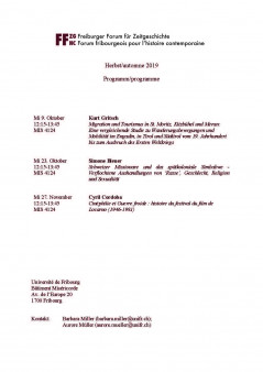 Das Forum dient dem wissenschaftlichen Austausch zu historischen Themen des 19. und 20. Jahrhunderts wie auch zu methodischen Fragen. Es bietet Raum für die ungezwungene Diskussion zu aktuellen Forschungsthemen und -projekten und verbindet dabei die französisch- und deutschsprachige Forschung des Bereichs Zeitgeschichte an der Universität Fribourg. L’objectif du forum est de constituer une plate-forme d’échanges entre historien.ne.s autour de thématiques de recherche sur les 19ème et 20ème siècles ainsi que sur des questions méthodologiques. Le Forum permet de discuter des projets et questions actuels de recherche et ainsi, d’intensifier les liens entre la recherche francophone et germanophone du domaine d’histoire contemporaine de l’Université de Fribourg.