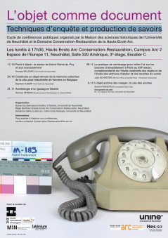 Dans le cadre du cycle de conférences publiques L’objet comme document. Techniques d’enquête et production de savoirs organisé par la Maison des sciences historiques de l’Université de Neuchâtel et le Domaine Conservation-Restauration de la Haute Ecole Arc.