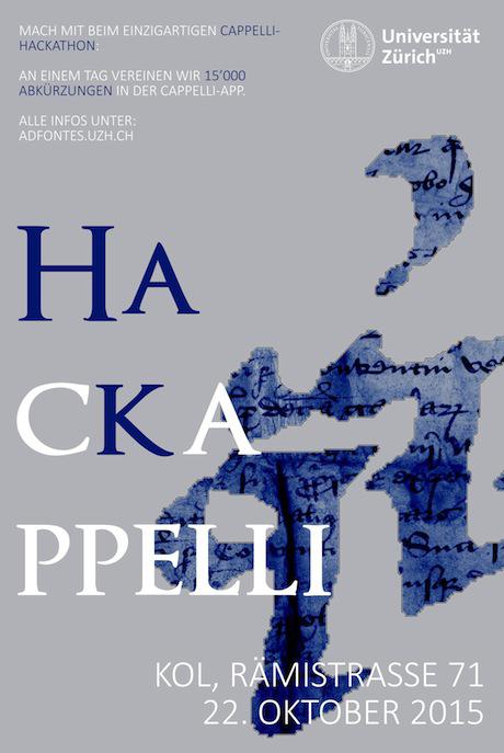 Am 22. Oktober 2015 führte das e-Learningprojekt «Ad fontes» einen Anlass durch, der in dieser Form an der Universität Zürich ein Novum darstellte: Der sogenannte Cappelli-Hackathon, kurz HaCkappelli. Ziel war die integrale Aufnahme von rund 15'000 Abkürzungen des Standardnachschlagewerks von Adriano Cappelli. Mittels einem eigens programmierten Crowdsourcing-Tool wurden die Abkürzungen digitalisiert und systematisiert, mit dem Ziel, sie später über ein speziell dafür zu entwickelndes Web-Interface offen zugänglich zu machen.