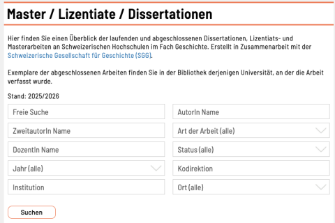 infoclio.ch führt in Zusammenarbeit mit der Schweizerische Gesellschaft für Geschichte (SGG) eine Datenbank zu den laufenden und abgeschlossenen Dissertationen und Masterarbeiten an Schweizer Hochschulen im…