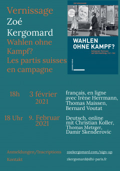Zusammen mit Prof. Dr. Christian Koller (Schweizerisches Sozialarchiv), Prof. Dr. Thomas Metzger (Pädagogische Hochschule St.Gallen) und Prof. Dr. Damir Skenderovic (Universität Freiburg) diskutiert Dr. Zoé Kergomard (Deutsches Historisches Institut Paris) ihr 2020 bei Schwabe erschienenes Buch: "Wahlen ohne Kampf? Schweizer Parteien auf Stimmenfang, 1947-1983" (Open Access, www.doi.org/10.24894/978-3-7965-4027-1)