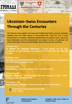 This lecture series explores the long and multifaceted history of Swiss-Ukrainian relations from the 19th century to the present day. From the role of Swiss entrepreneurs in Ukraine’s industrial modernization to political exiles inspired by Swiss federalism and the humanitarian ties forged in times of upheaval, the series sheds light on the historical bridges that connect the two countries.
