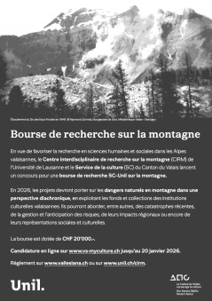 En vue de favoriser la recherche en sciences humaines et sociales dans les Alpes valaisannes, le Centre interdisciplinaire de recherche sur la montagne (CIRM) de l’Université de Lausanne et le Service de la culture du Canton du Valais lancent un concours pour une bourse de recherche sur la montagne.