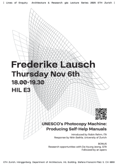 Hosted by the Institute for the History and Theory of Architecture (gta) at ETH Zurich, Lines of Enquiry is a new lecture series that provides a platform for postdoctoral researchers to share their current work. Focusing on original and critical approaches to architecture and its histories, the series invites scholars to present emerging architectural research and experimental methodologies. Lines of Enquiry aims to open up space for dialogue and exchange with colleagues and students of the Department of Architecture at ETH Zurich.