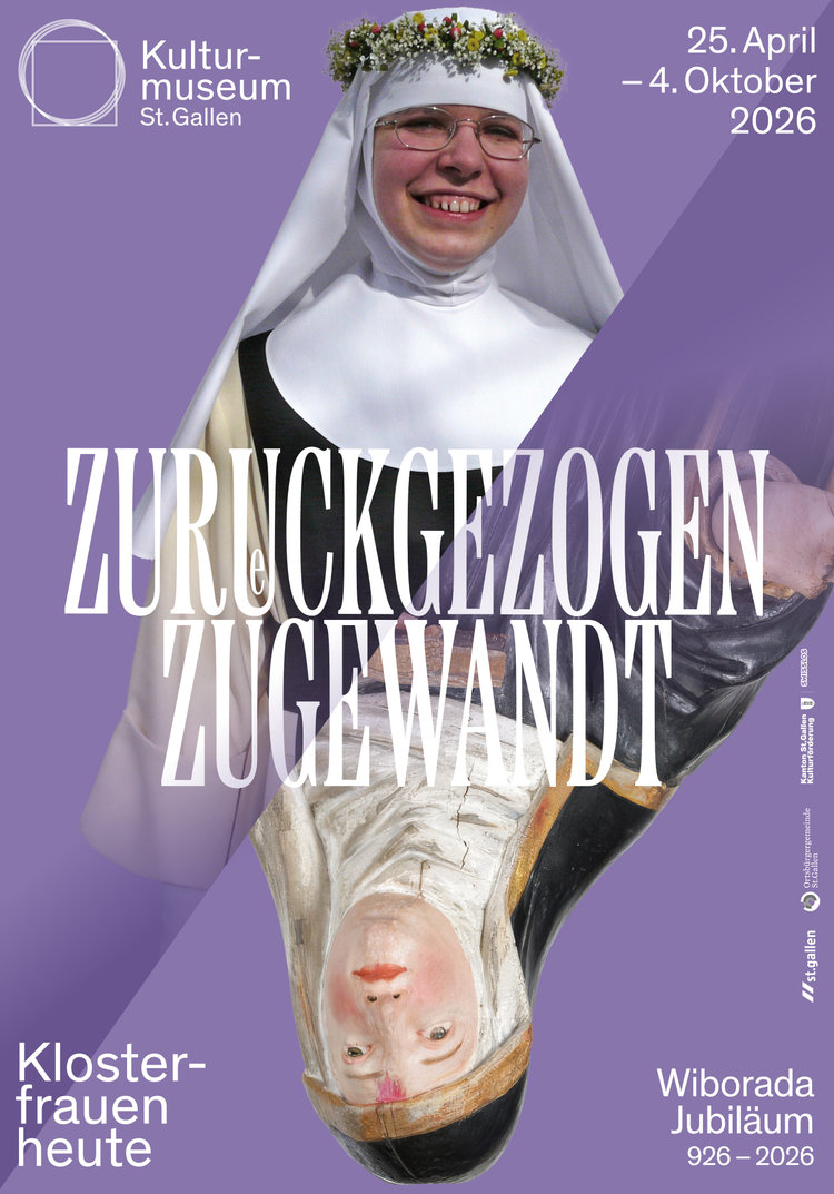 Zum 1100-Jahr Jubiläum der Heiligen Wiborada von St.Gallen widmet sich die Studioausstellung ganz besonderen Frauen, die sich wie Wiborada für einen spirituellen Lebensweg entschieden haben. Sie erzählen vom Leben im Kloster, ihrem Wirken als Eremitin oder von ihren Erfahrungen als mobile Inklusin. Es sind Frauen, die ihr Dasein selbstbestimmt und mit innerer Stärke in den Dienst eines grösseren Ganzen stellen, sich der Kontemplation, aber auch der Gemeinschaft und damit auch unserer Gesellschaft widmen.