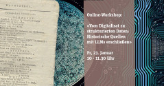 Online-Workshop zum Thema «Vom Digitalisat zu strukturierten Daten: Historische Quellen mit LLMs erschließen». Am Freitag, 23. Januar von 10 bis 11.30 Uhr gibt Sarah Kiener, Softwareentwicklerin und Machine-Learning-Expertin des ZB-Lab, spannende Tipps zur digitalen Erschliessung von historischen Quellen. Die Teilnahme ist kostenlos und kann ohne Voranmeldung besucht werden.